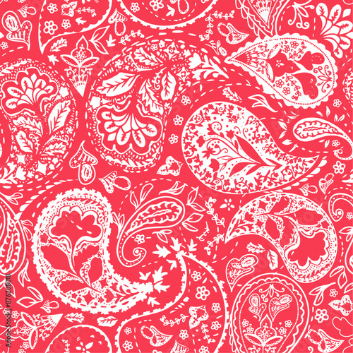 Two tone, hand drawn paisley seamless repeat pattern. Random placed, vector arabic elements aop, all over surface print on coral background.