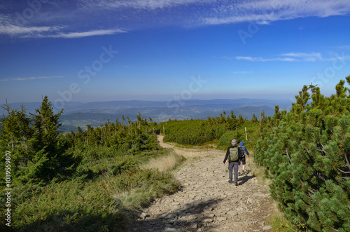 two tourists on the trail from Korbielów to Pilsko in the Beskid Mountains