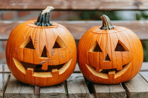 Two Traditional Jack-O'-Lanterns With Unique Facial Expressions on a Wooden Table