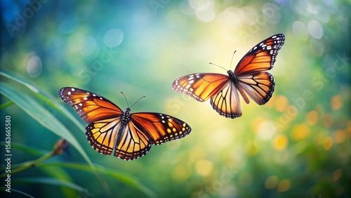 Two vibrant butterflies gracefully soar through a sunlit meadow, wings ablaze with orange and black, a gentle breeze carrying them amidst lush green foliage and soft bokeh background.