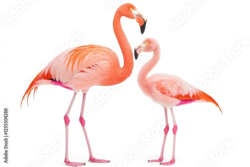 Two vibrant flamingos, one adult and one juvenile, standing gracefully together