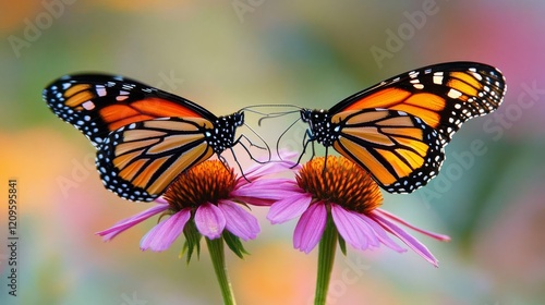 Two vibrant monarch butterflies feeding on a pink coneflower in a sunlit garden, showcasing nature’s beauty and pollination in action