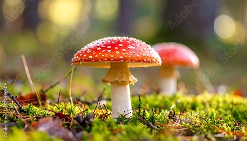 mushroom, red, forest, nature, fungal, autumn, moss, ground, sunlight, bright, high-coloured, detail, closeup, macro, wild, beautiful, landscape, flora, fungal, blood-red, spot, cap, stem, growth, organism, ecology, forest floor, green, yellow, orange, autumn, leaf, botanical