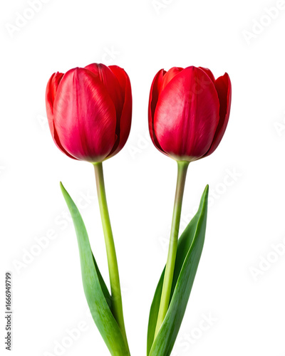 Two vibrant red tulips stand tall isolated on a pure transparent background