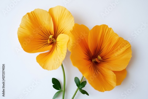 Two vibrant yellow flowers elegantly positioned on the left side, isolated against a clean white background, minimalistic and modern composition, soft natural lighting, ultra-detailed realism