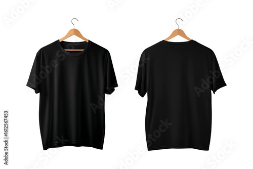 Two views of a plain black short sleeved t shirt hanging on a wooden clothes hanger isolated on transparent background