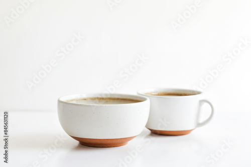 Two white ceramic mugs with brown rim on white background