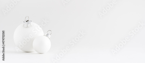Two white Christmas baubles, balls on white background. Holiday simple, monochromatic banner with copy space. Mockup