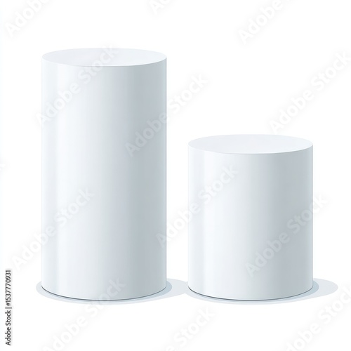cylinder, white, dais, pedestal, display, racked, stage, product, presentation, empty, blank, geometric, three-dimensional, illustration, graphic, design, object, shape, round, tall, short, pair, contrast, isolated, light, shadow, realistic, modern, simple, clean, minimalist, showcase, decoration, exhibition, award, winner, high, low, promotion, advertising, vector