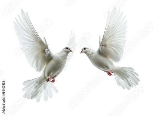 Two white doves holding flowers in flight, isolated against a clean white background. PNG transparent.