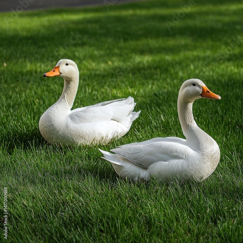duck, bird, water bird, nature, grass, wildlife, animal, white, green, park, lawn, resting, sunny, outdoors, feather, plumage, beak, duck pond, lake, water, serene, peaceful, calmness, avian, summer, spring, meadow, pasture, ground, sunlight, environment, fauna, backyard, garden, agriculture, farming, poultry, domestic, pair, duet, couple, companionship, together, calm, still, natural, beauty, outside