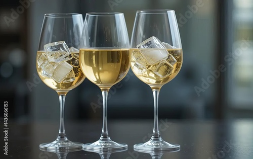 Two wine glasses filled with white wine and ice, with a bottle of white wine and a bowl of ice in the background