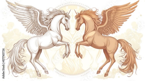 Two winged horses on white background, one white and one brown, rear on their hind legs label design " ai generated "