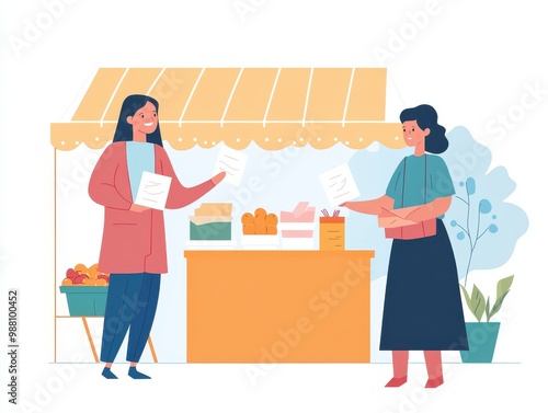 Two women interacting at a vibrant market stall, exchanging lists of fresh produce and goods, showcasing a lively atmosphere.