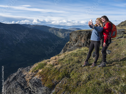 Two women using their cell phone to take a self-portrait and exploring the mountains and wilderness of the Yukon around Haines Junction; Yukon, Canada