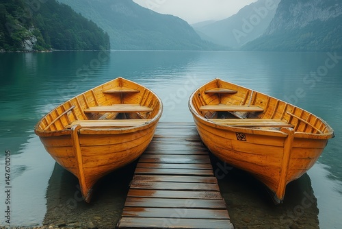 Two wooden boats anchored at a serene lake surrounded by misty mountains in early morning light