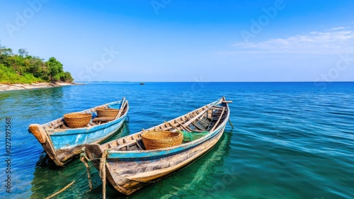 Two wooden boats with baskets on calm blue sea near lush green coastline under clear sky