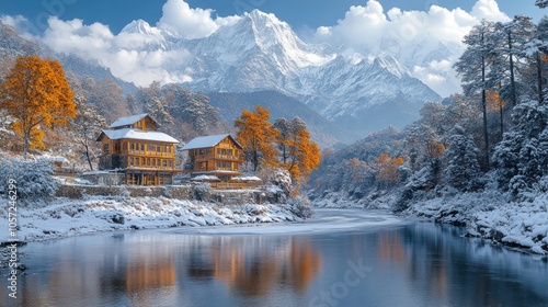 mountain, snow, house, winter, landscape, nature, tree, sky, cloud, forest, water, river, calm, peace, scenic, beautiful, tranquil, serenity, glacé, cold, frost, season, village, bungalow, alpine, peak, range, blue, white, brown, yellow, green, orange, autumn, fall, travel, tour tourism, scenery, fresh, clean, bright, peaceful, harmony, idylli, serene, pure, charming