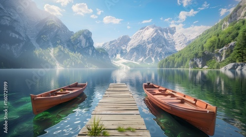 Two wooden rowboats on a serene lake, with a wooden dock, surrounded by mountains, forests, and a clear sky.
