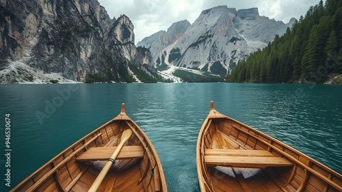 Two wooden rowing boats, symbolizing unity and collaboration, gently floating on the calm waters of lake in the Dolomites mountains of Italy, Europe. Landscape photography, panorama