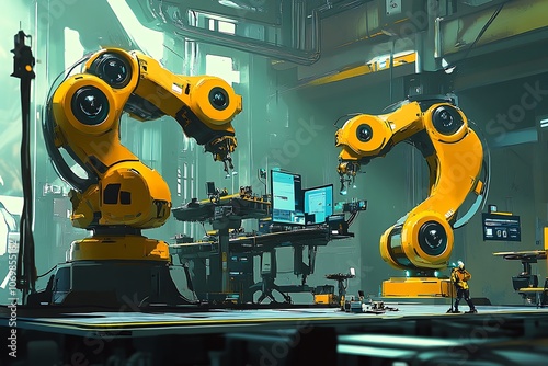 robotic, arm, arm, factory, futuristic, industrial, automation, technology, yellow, metal, machinery, steel, robot, robot, human, men at work, person, figure, silhouette, green, blue, grey, wall, floor, ceiling, screen, monitor, panel, control, wire, cable, pipe, light, shadow, perspective, digital, art, illustration, painting, concept, design, science, fiction, future