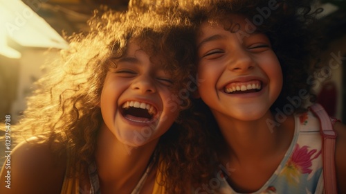 Two young girls with curly hair are smiling and laughing together. Concept of happiness and joy, as the girls share a moment of laughter and connection