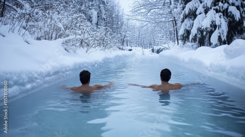 Two young males swimming in snowy outdoor pool amid winter landscape