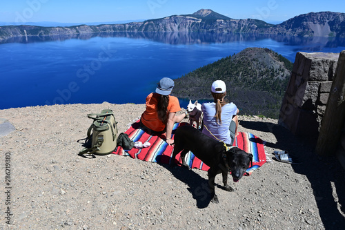 Two young women and their dogs enjoy view of Crater Lake and Wizard Island at Crater Lake National Park, Oregon on a clear summer afternoon.