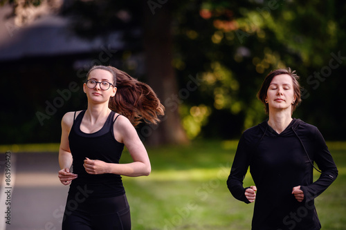 Two young women in black sportswear jogging side by side on a park path, exemplifying fitness, friendship, and a healthy lifestyle.