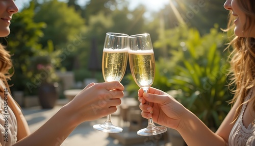woman, friends, champaign, flute, toasting, outdoors, sunny day, celebration, friendship, happiness, summer, party, bubble, drink, alcohol