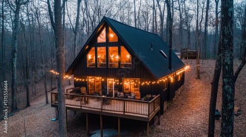Two-story mountain cabin with a wraparound deck, panoramic views, and warm interior lighting