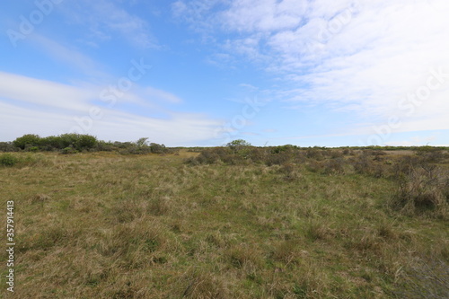 Typical dutch landscape in the coastal area with trees, dunes and a beautiful blue sky and white clouds.