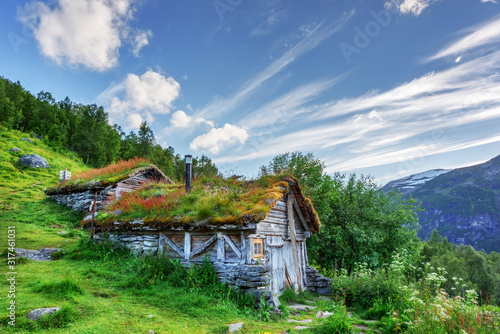 Typical norwegian old wooden houses with grass roofs near Sunnylvsfjorden fjord and famous Seven Sisters waterfalls, western Norway. Landscape photography