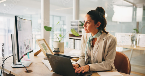 Typing, computer or research with businesswoman in office for news editor, article reporter or fact check. Review, writer department or publication with mature person in media agency for proofreading
