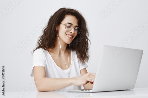 Typing message to answer on tricky question from friend. Pleased happy young woman working with laptop, smiling broadly, enjoying great sound while listening music in earphones, browsing in net