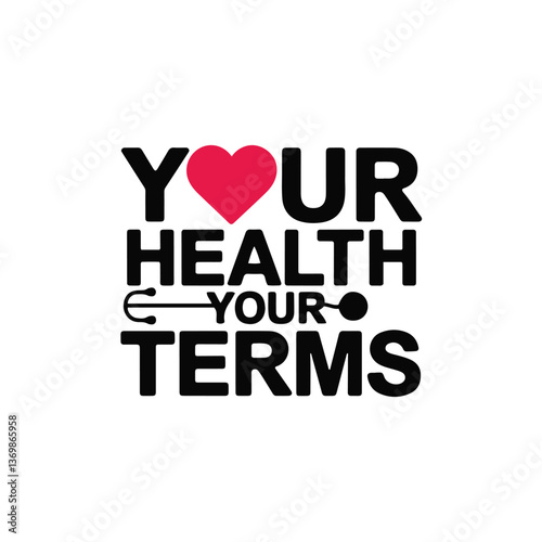 Typographic health message, bold black text, red heart symbol, medical stethoscope icon, minimalist design, white background, health empowerment slogan, clean font, graphic design, wellness motivat