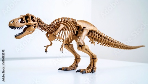dinosaur, skeleton, model, bone, fossil, prehistoric, anatomy, teeth, skull, tail, limb, dynamic, pose, structure, replica, paleontology, science, education, museum, display, extinct, creature, species, evolution, wood, plastic, material, isolated, background, white, minimal, clean, detailed, dramatic, iconic, ancient