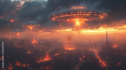 flying saucer, floating, in, air, over, burning, city, mysterious, alien, spaceship, flying, object, extraterrestrial, hovering, fire, flames, destruction, smoke, chaos, apocalypse, fi, glowing, eerie, dramatic, intense, surreal, atmospheric, dark, invasion, disaster, catastrophy, futuristic, paranormal, ominous, nightmarish, war, ruin, devastation, metallic, saucer, threatening, terrifying, explosive, cinematic, interstellar