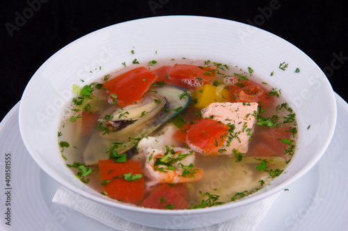 Ukha - fish soup with salmon slices, shrimp and mussels with red bell pepper