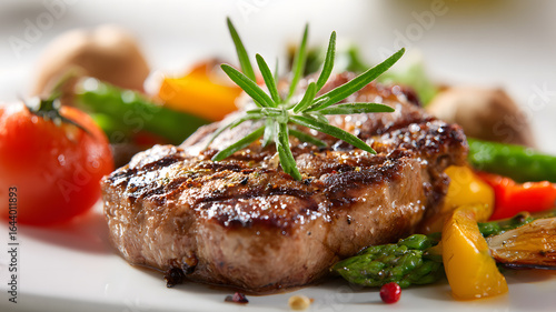Ultra HD A perfectly grilled steak served with fresh vegetables, including tomatoes, peppers, and mushrooms, garnished with rosemary, creating a delicious and gourmet dining experience