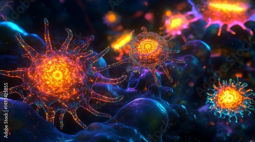 magnified, glowing, chaotic, fractal, network, science, fantasy, futuristic, surreal, microscopic, biology, alien, neon, virus, research, innovation, ecosystem, intricate, microbiology, plasma, biotechnology, evolution, magnification, imagination, illuminated, anatomy, chemistry, medicine, microscope, molecular, organism, cellular, technology, microorganism, futurism