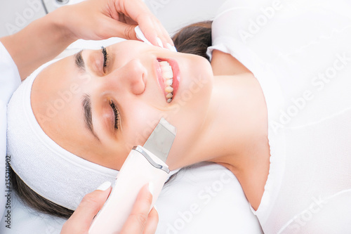 Ultrasonic facial cleansing by a cosmetologist. Ultrasonic face peeling machine.