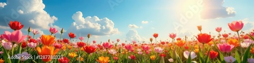 Un campo de flores en flor bajo un cielo anaranjado, flores, hermoso