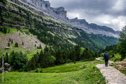 Un deportista camina por un sendero junto al río Arazas con los bosques mixtos de coníferas y hayas, y las paredes rocosas del valle glaciar del Parque Nacional de Ordesa, en los Pirineos españoles