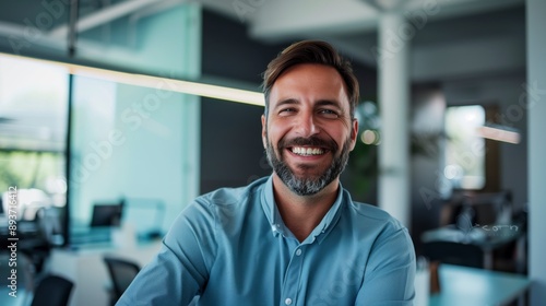 Un hombre de negocios en la oficina de una empresa startup sonriendo