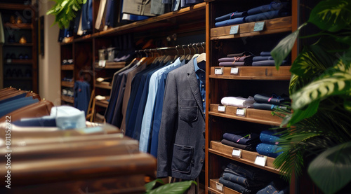 Un intérieur d'une boutique pour homme moderne avec des étagères en bois présentant des costumes, vestes et chemises.