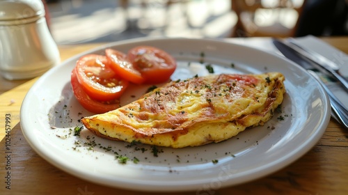 Un omelette acompañado de rodajas de tomate fresco, servido en un restaurante soleado.