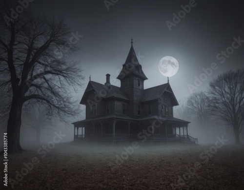 Una casa inquietante emerge dalla nebbia tra gli alberi, con finestre scure che sembrano seguire ogni movimento.