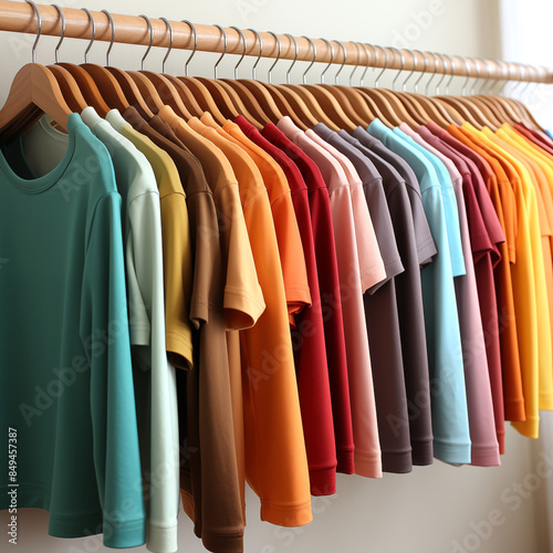 Una hilera de ropa colgada en un perchero, con variedad de colores y estilos. La ropa está bien organizada en tienda de ropa o un guardarropa.