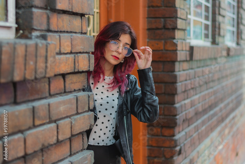 woman, outdoors, face, brick, street, hair, staircase, wood, sitting, looking, glamour, glasses, portrait, face, people, person, able, feminism, young, beautiful, city, style, make-up, leather jacket